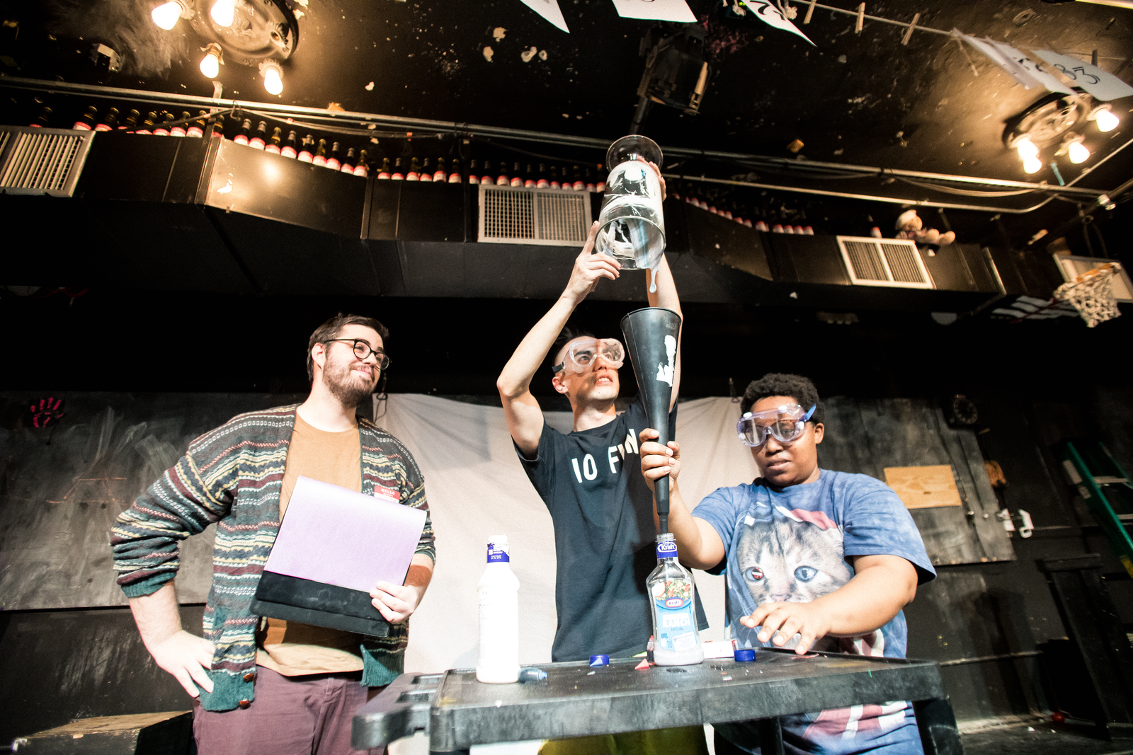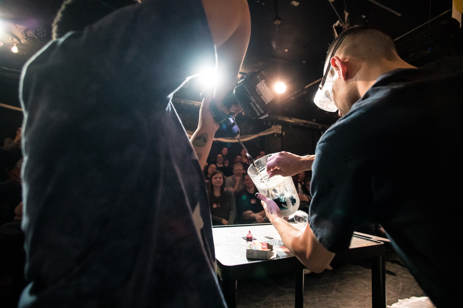 In custom ranch, two scientists and an audience member dye, mix, and re-bottle ranch dressing.